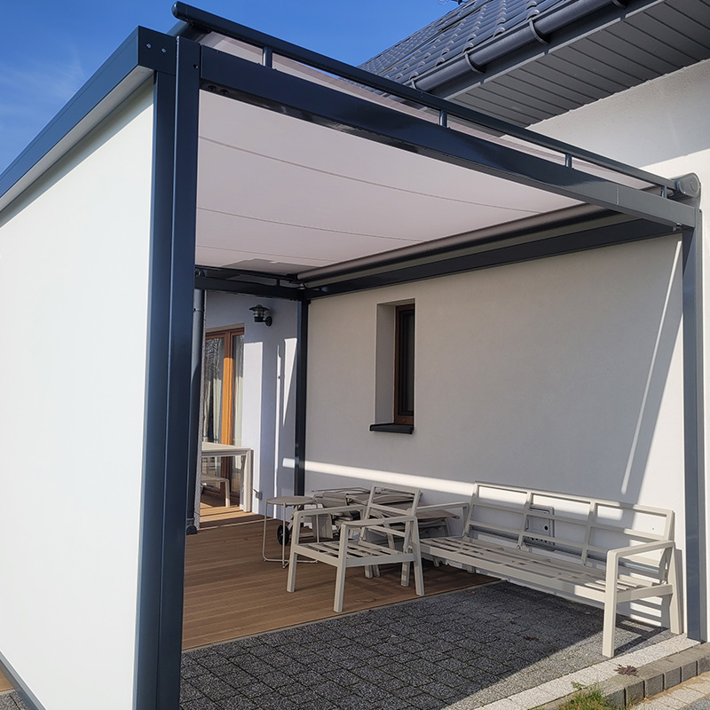 Pergole tkaninowe to zadaszenie tarasowe z rozsuwanym dachem wykonanym z wysoko odpornej tkaniny zacieniającej. Konstrukcję posiadają z ekstrudowanego aluminiowego profilu oraz elementów ze stali nierdzewnej.